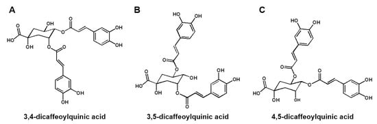 Structures of three DCQAs isolated from WSE. Structures of 3,4-DCQA (A), 3,5-DCQA (B) and 4,5-DCQA (C) isolated from WSE.