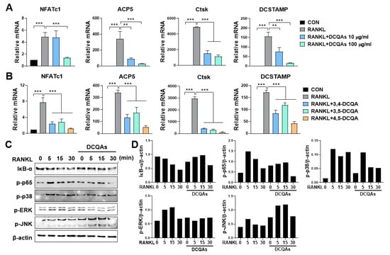Three DCQA derivatives from WSE regulated RANKL-induced osteoclastogenesis by influencing osteoclast-specific gene expression and inhibiting NF-κB and MAPKs. BMDMs were pretreated with DCQA fractions (10 and 100 μg/mL) and three constituent DCQAs (10 μΜ) for 2 h and subsequently stimulated with RANKL for 3 days. Regulation of gene expression levels of NFATc1, ACP5, Ctsk, and DCSTAMP via the DCQA fractions and the three constituent DCQAs (A,B) was determined using qPCR. β-actin was used as the internal control. Western blotting was used to analyze the expression of IκB-α degradation, as well as the phosphorylation of p65, p38, ERK, and JNK in RANKL-stimulated BMDMs (C). Antibody against β-actin was used to confirm the loading doses. Quantification of protein levels was performed using ImageJ software (D). The results are presented as the mean ± SD. ** p < 0.01; *** p < 0.001.