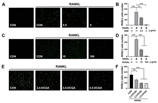 WSE and its compounds suppressed RANKL-induced ROS production. BMDMs were pretreated with WSE (0.5 and 5 μg/mL), DCQA fractions (10 and 100 μg/mL), and three constituent DCQAs (10 μM) for 2 h and subsequently stimulated with RANKL. After 24 h, cells were incubated with DCFDA (2′, 7′-dichlorofluorescin diacetate) and analyzed using fluorescence microscopy (A,C,E). The number of ROS-positive cells was counted in each well (B,D,F). The results are presented as the mean ± SD. ** p < 0.01; *** p < 0.001.