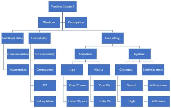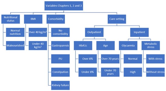 Organisation chart of the variables used to build the clinical scenarios for Chapters 1, 2 and 3. BMI: body mass index; PU: pressure ulcer; HbA1c: glycosylated haemoglobin.