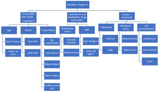 Flowchart of the variables used to build the clinical scenarios for Chapter 4. BMI: body mass index; HbA1c: glycosylated haemoglobin; EN: enteral nutrition.