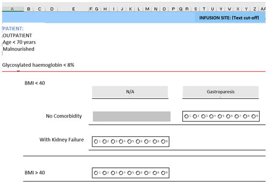 There was also agreement that the specific high-calorie and high-protein formulas for diabetes would be inappropriate for inpatients with good glycaemic control and without metabolic stress, who also have a BMI of over 40 kg/m2, and for outpatients with normal nutrition, who also have a BMI of over 40 kg/m2. This may have been due to the calorie content of this type of formula. However, there was no agreement among the panellists regarding its use for patients with BMIs of over 40 kg/m2 who were inpatients with metabolic stress or who were malnourished outpatients. Although there are no good-quality clinical trials on this topic, current evidence suggests that low-calorie nutrition could improve outcomes for critically obese patients due to a lower rate of infectious complications and better control of hyperglycaemia. Thus, low-calorie and high-protein nutrition should be standard practices in the nutritional support of critically obese patients if there are no contraindications for it [16].