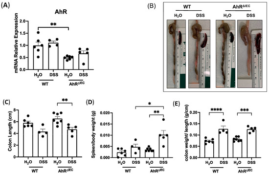 Next, the severity of DSS-induced chronic inflammation in the colons of WT and AhRΔIEC mice was examined. Notably, we observed drastically shorter colons and larger spleens in AhRΔIEC mice treated with DSS than in the WT mice treated with DSS (Figure 1B–D). Strikingly, the spleen/body weight ratio significantly increased in AhRΔIEC mice treated with DSS compared to treated WT mice (Figure 1D). Both the WT and AhRΔIEC mice treated with DSS had similar increases in the colon weight/length ratio indicative of diarrhea (Figure 1E). All together, these phenotypes indicate worsened response to DSS-induced chronic colitis in AhRΔIEC mice compared to WT.