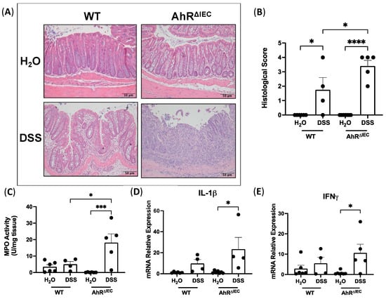 Deletion of AhR in IECs exacerbates DSS-induced chronic colitis in mice. (A) H&E stains of distal colon of WT and AhRΔIEC mice, (B) their histological scores, and (C) MPO activity. mRNA expression normalized to GAPDH of (D) IL-1β and (E) IFNγ. Histological scores: 0—no inflammation, 1—quiescent, 2—mildly active, 3—moderately active, 4—severe. Values are mean ± standard error of mean. Data were analyzed by one-way ANOVA; * p < 0.05, *** p < 0.001, **** p < 0.0001.