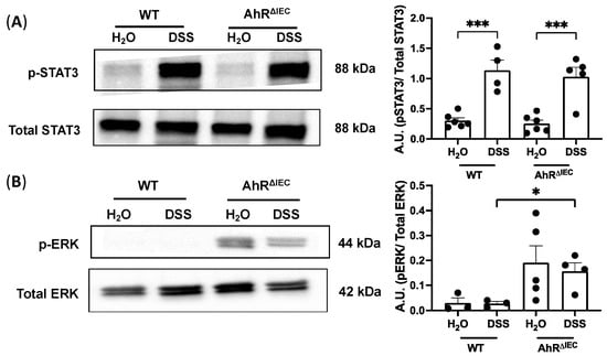 Phosphorylated STAT3 and phosphorylated ERK levels in WT and AhRΔIEC mice. Western blots of (A) phosphorylated STAT3 normalized to total STAT3 and (B) phosphorylated ERK normalized to total ERK. Values are mean ± standard error of mean. Data were analyzed by one-way ANOVA; * p < 0.05, *** p < 0.001. A.U., arbitrary units.