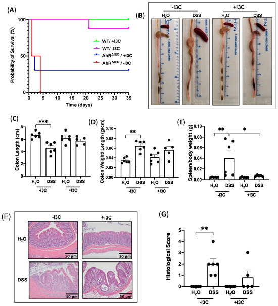 Inflammatory bowel diseases (IBDs), including Crohn’s Disease (CD) and ulcerative colitis (UC), are characterized by chronic inflammation of the gastrointestinal tract [1]. Though the exact cause of IBD is unknown, its pathophysiology is multifactorial, with genetic predispositions, immune dysregulation, gut dysbiosis, and environmental factors such as diet playing a role in the onset and progression of these diseases [1]. Current therapeutic strategies for the treatment of IBD symptoms include anti-inflammatory aminosalicylates, immunosuppressives, antibiotics, TNF-antagonists, the recently approved integrin alpha4beta7 antagonist, and Janus Kinase (JAK) inhibitor [2]. However, each of these drugs yield moderate success rates with significant side effects [3]. Recently, the aryl hydrocarbon receptor (AhR) has gained recognition as a potential therapeutic target for IBD after being identified as an IBD susceptibility gene in a genome-wide association study (GWAS) [4]. Activation of AhR is crucial for xenobiotic detoxification and the maintenance of intestinal homeostasis [5]. After ligand binding, AhR, which is present in the cytoplasm, codimerizes with the AhR nuclear translocator (ARNT) and moves to the nucleus to bind to the xenobiotic response element (XRE) on DNA, resulting in the induction of xenobiotic metabolizing enzymes, Cytochrome P450 Family 1 Subfamily A Member 1 (CYP1A1) and CYP1B1, as well as Interleukin-10 (IL-10) and IL-22 [6]. As AhR is ubiquitously expressed, previous studies have interrogated the cell-specific roles of AhR in modulating acute intestinal inflammation [7,8,9]. These studies demonstrated worsened inflammation in mice with intestinal epithelial cell (IEC)-specific constitutive deletion of AhR in acute colitis [8,9]. Consistently, activation of AhR has been shown to be beneficial in models of acute inflammation [10,11,12,13]. However, the therapeutic potential of AhR and its dietary ligands in preclinical models resembling the chronic nature of human IBD has not been systematically investigated. Glucobrasscin found in Brassicaceae family vegetables such as broccoli, cabbage, and brussels sprouts is broken down into indole-3-carbinole (I3C), a well-recognized dietary component and AhR agonist [14]. Notably, the gastric acid breakdown of I3C also results in the products 3,3′-diindolylmethane (DIM) and indole [3,2-b] carbazole (ICZ), potent agonists of AhR [14]. A recent study showed intraperitoneal administration of I3C reduced intestinal inflammation in a mouse model of TNBS-induced colitis via alterations in the gut microbiota [15]. Similarly, other dietary AhR ligands such as tryptophan and β-napthoflavone (BNF) have been shown to attenuate intestinal inflammation [16,17]. However, an in-depth analysis of how I3C through dietary consumption impacts ulcerative colitis as well as ileitis resembling CD has not yet been investigated. Given the translational potential of dietary modifications for IBD, we aimed to investigate the impact of inducible deletion of AhR from IECs and dietary I3C manipulations in models of IBD resembling human IBD. Our data strongly highlight how diet can shape the inflammatory response and microbiota, as well as emphasizing how nutritional strategies can be exploited to improve chronic intestinal inflammation.