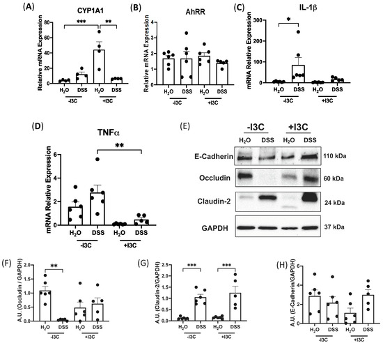 Supplementation of dietary I3C attenuates DSS-induced colitis in WT mice. WT mice were induced with chronic colitis and fed −I3C or +I3C diets. mRNA levels normalized to GAPDH of AhR target genes (A) CYP1A1 and (B) AhRR and proinflammatory cytokines (C) IL-1β and (D) TNFα. (E) Western blots of tight junction proteins and quantifications of (F) Occludin, (G) Claudin-2, and (H) E-Cadherin, all normalized to GAPDH. Values are mean ± standard error of mean. Data were analyzed by one-way ANOVA; * p < 0.05, ** p < 0.01, *** p < 0.001. A.U., arbitrary units.