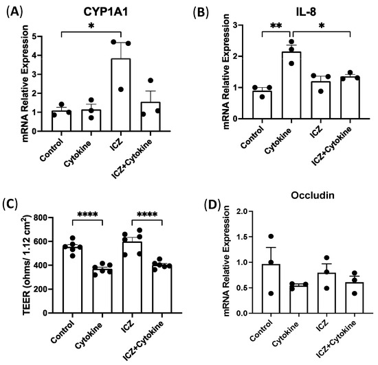 Effect of ICZ on model intestinal epithelial cells treated with cytokines. Caco-2 cells plated in 12-well microporous transwells were treated in the basolateral compartment with a cytokine cocktail of IL-1β (50 ng/mL), IFNγ (30 ng/mL), and TNFα (50 ng/mL). mRNA levels normalized to GAPDH of (A) CYP1A1 and (B) IL-8. Changes in permeability were measured by (C) transepithelial electrical resistance (ohms) and (D) mRNA levels of Occludin normalized to GAPDH. Values are mean ± standard error of mean. Data were analyzed by one-way ANOVA; * p < 0.05, ** p < 0.01, **** p < 0.0001.