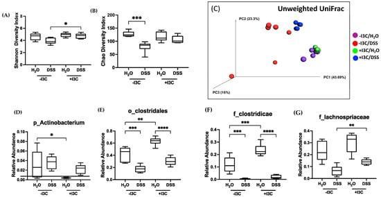 To assess the role of the gut microbiota in response to dietary I3C, cecal contents derived from mice fed −I3C or +I3C diets and treated with or without DSS were subject to 16S rDNA sequencing by ZymoBiomics (Irvine, CA, USA). The total abundance of cecal bacteria did not change between groups (Supplementary Figure S3A); however, the bacterial alpha diversity, as assessed by the Shannon and Chao indices, was significantly increased in mice with chronic colitis supplemented with I3C when compared with DSS mice depleted of dietary AhR ligands (Figure 8A,B). Similarly, Fisher Alpha and total observed species showed significant decreases in diversity in mice fed −I3C and treated with DSS (Supplementary Figure S3B,C), and phylogenetic diversity showed a drastic decrease in mice fed −I3C and treated with DSS, which was recovered with the addition of I3C (Supplementary Figure S3D). The beta diversity assessed by unweighted Unifrac (Figure 8C) revealed that control mice fed −I3C or +I3C diets (purple and green, respectively) are functionally similar, whereas mice treated with DSS and fed the −I3C or +I3C diets (red and blue, respectively) are each clustered separately, demonstrating functionally distinct microbiota between treatments and diets. Notably, mice fed +I3C diet and treated with DSS (blue) are clustered closer to mice treated without DSS and depleted of the dietary ligand (purple), demonstrating the importance of dietary I3C in maintaining microbial diversity. This illustrates the improvement in microbial diversity and functionality in the presence of dietary AhR ligands in chronic DSS treatment.