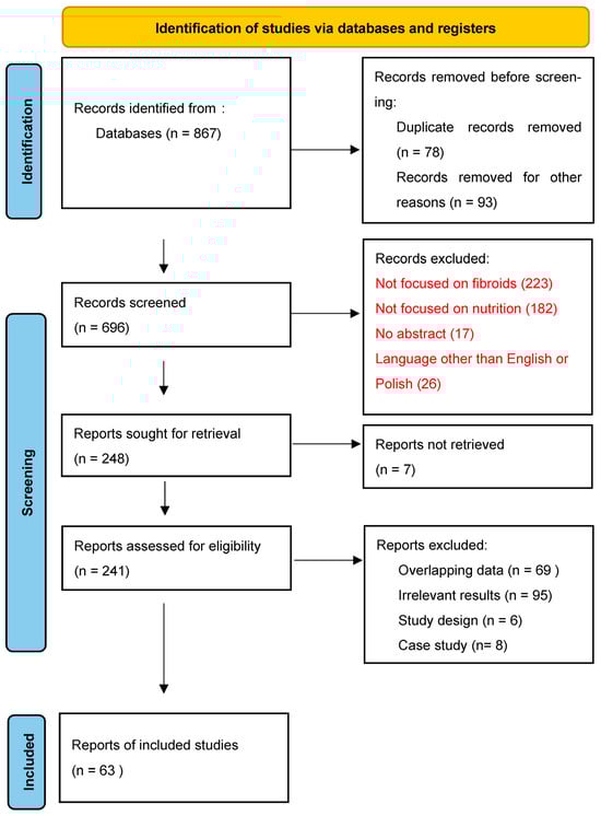 Due to limited knowledge on molecular mechanisms, there is a lack of long-term non-invasive treatment options for UF [14]. Moreover, in most cases, the impact of diet and nutrition on the risk and progression of uterine fibroids remains unclear, with existing data being insufficient to draw firm conclusions. Given the diversity of research regarding nutrients such as vegetables and fruits or vitamin D and, on the other hand, the sparse data and limited studies regarding other nutrients and vitamins, we have undertaken a scoping review. The aim of this review is to investigate the effect of dietary components and interventions in pathogenesis, prevalence and symptoms of uterine fibroids. Identifying potential gaps in the existing literature and highlighting the mechanisms by which nutrition influences the development of UF may provide directions for future research.