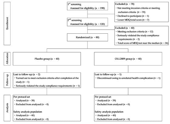The effect size of OLL2809 in this study was predicted to be 0.7 based on a previous study involving patients with endometriosis []. With a significance level of 5% and power of 80%, the required sample size was calculated to be 66; the number of participants per group was 33 for a total target sample size of 80 participants. This accounted for potential exclusions from the efficacy analysis and an estimated dropout rate of approximately 10%.