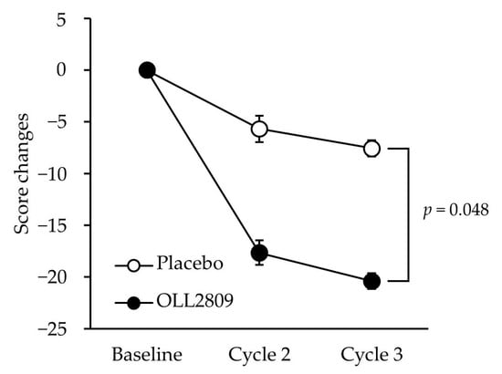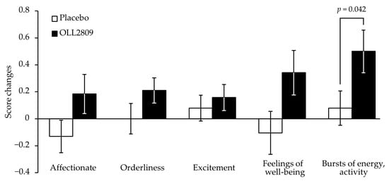 Table 2 shows the changes in MDQ scores during the premenstrual period and the treatment differences estimated using multiple regression analysis in the PPS analysis. The baseline values of the FAS are shown in Table S2. No significant differences were observed in physical or psychological scores between the two groups. However, OLL2809 ingestion had a significant positive effect on the score changes in the ‘arousal’ subfactor, values minus baseline (Table 2; p = 0.023). The score changes were consistently higher in the OLL2809 group than in the placebo group throughout the study period, and the difference became statistically significant in cycle 3 (Figure 3; p = 0.023). Further analysis of the ‘arousal’ subfactor revealed that the item ‘bursts of energy, activity’ was significantly higher in the OLL2809 group compared to the placebo group (Figure 4; p = 0.042). There were no significant differences between the groups in the items of ‘affectionate’, ‘orderliness’, ‘excitement’, and ‘feelings of well-being’.