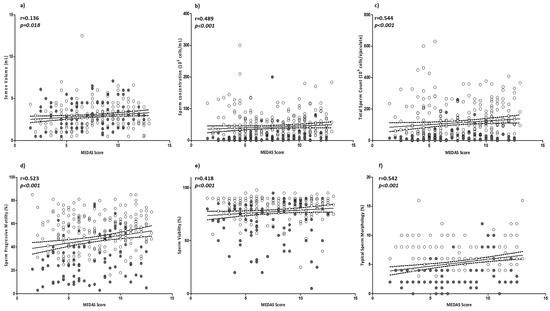 All statistical analyses were performed using SPSS software (Version 25, SPSS Inc., Chicago, IL, USA). Values of p < 0.05 were considered statistically significant. The results were expressed as mean ± standard deviation (SD). The differences between continuous variables were analyzed with ANOVA. The differences between discrete variables were analyzed with a Chi-square test or Fisher test (if the expected count was <5). The Pearson correlation index or the Spearman correlation index for non-normally distributed variables were used to describe the correlations between variables. On the basis of correlation analyses, we then performed multilinear regression analyses to compare the semen parameters most associated with MEDAS value, after adjusting for the following confounders: age, BMI, and smoking habits.