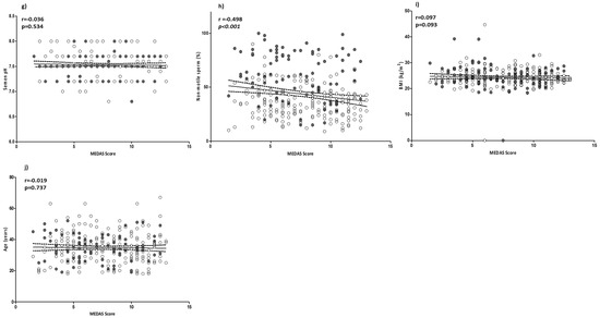 In order to evaluate the possible role of MD adherence on sperm parameters, a correlation analysis was performed between the MEDAS value and sperm parameters. All sperm parameters, with the exception of pH (p = 0.534), were positively and significantly associated with MEDAS. In particular, sperm concentration, total count, progressive motility, viability, and typical sperm morphology were positively and strongly associated with the MEDAS value. Consequentially, the percentage of not-motile spermatozoa showed a negative correlation (r = −0.498; p < 0.001) with MEDAS. Of note, the strongest level of association observed was between MEDAS and sperm count, then typical sperm morphology, followed by sperm progressive motility. No significant correlation was found between MEDAS and BMI or age (p = 0.093 and p = 0.737, respectively) (Figure 1a–j).
