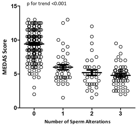 Using this analysis, we observed that subjects with normozoospermia had the highest MEDAS values. The cumulative number of sperm alterations was inversely related to the MEDAS value (p for trend < 0.001).