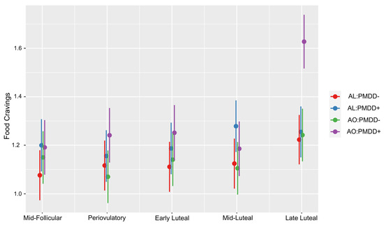 Analysis of the unadjusted model revealed main effects of subphase (F = 13.48; p = 2.62 × 10−10), group (F = 4.01; p = 0.01), and subphase*group interaction (F = 3.28; p = 0.0001) (Figure 1). Relative to the reference MF subphase and AL:PMDD− group, food cravings significantly increased in the LL subphase (t-value =2.50; p ≤ 0.01), and the AL: PMDD+ group had higher food cravings in the LL subphase (t-value = 3.34; p ≤ 0.001) (Supplementary Table S1). Analysis of the adjusted model revealed that the significant effects of the unadjusted model remained such, with increased food cravings in the LL subphase (t-value = 2.54; p ≤ 0.05) and increased LL food cravings in the AO: PMDD+ group (t-value = 2.37; p ≤ 0.05). The analysis contrasting groups within each subphase showed that the AO: PMDD+ group had a highly significant increase in food cravings relative to all three study groups in the LL subphase: the AL: PMDD− group (t-ratio = 5.27; p ≤ 0.0001), the AL: PMDD+ group (t-ratio = 4.78; p ≤ 0.0001), and the AO: PMDD− group (t-ratio = 4.87; p ≤ 0.0001) (Table 2). No other contrasts were significant.