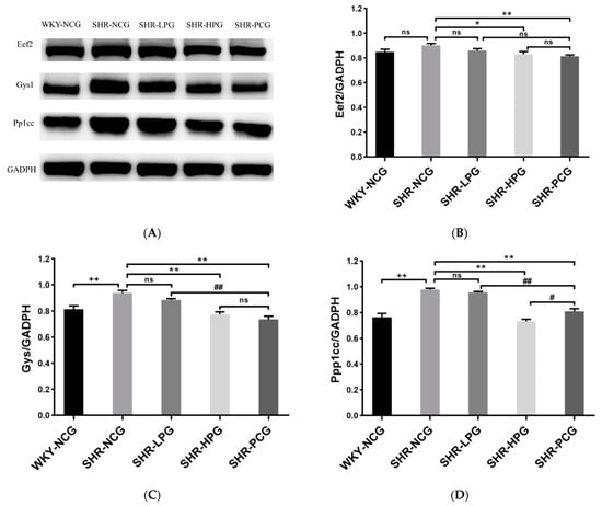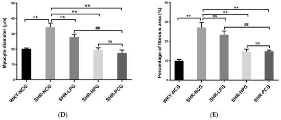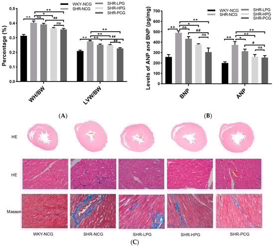 3.1. Effects of BGP on Myocardial Hypertrophy and Myocardial Fibrosis in SHR