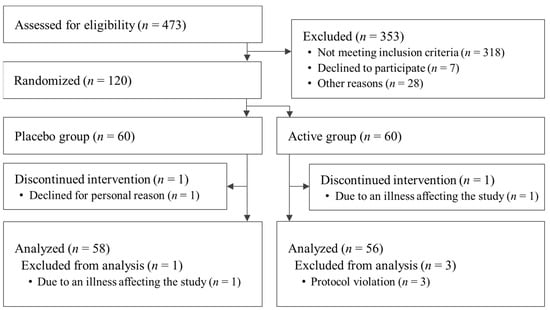 The flow chart of study participation is shown in Figure 1. A total of 473 participants were screened for this study. After screening, 120 participants were eligible: 60 were assigned to the active group and 60 were assigned to the placebo. A significant difference in basophil ratio between the active and placebo groups was observed at the beginning of the study but was deemed acceptable because it was within the reference range. For the other items, there were no differences in the baseline characteristics of the participants’ data (Table 2). Dietary consumption for the three days prior to the measurement is summarized in Table 3. It was concluded that the results of dietary consumption did not significantly affect the results of this study. The fat intake of the active group at week 12 was significantly less than that of the placebo group. The difference in mean fat intake between the active and placebo groups was 8.2 g/day or 73.8 kcal/day in terms of calories. Considering the energy intake recommended for the participants in this study [48], this change was only 2.8–3.8% of the daily energy intake. In addition, the difference between groups in the degree of change in VFA, discussed below, was confirmed from week 8; it was determined that this difference between groups, confirmed at week 12, did not have a significant impact on the study. Also, energy and protein intakes at week 12 were significantly reduced compared with week 0 in both the active and placebo groups. Changes in energy and protein intake from baseline in the active and placebo groups were determined not to have affected the study results because there were no significant differences between the groups. Carbohydrate and fiber intakes at week 12 in the placebo group were significantly reduced compared with baseline but this was determined not to have affected the study results because there were no significant differences between groups. By the end of the study, one participant from the active group withdrew due to an illness unrelated to the study that may have affected the results, and one participant from the placebo group withdrew for personal reasons. After the completion of the entire study, one participant from the placebo group was excluded due to a confirmed illness unrelated to the study that may have affected the results. In addition, three participants were excluded because they were found to have consumed drugs or foods during the study period that might have affected the results (n = 1 from the active group and n = 2 from the placebo group). Thus, a total of 114 patients (58 in the active group and 56 in the placebo group) were included in the analysis. There were no reported harms or unintended effects in either group.