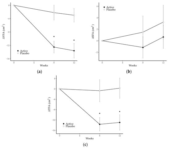 Changes in (a) visceral fat area, (b) subcutaneous fat area and (c) total fat area in the placebo and active groups during the study period. Values are the means, with error bars as standard error. Asterisks (*) indicate a p-value < 0.05 as a result of inter-group difference (the placebo group vs. the active group; unpaired t-test with Benjamini–Hochberg procedure). SFA, subcutaneous fat area; TFA, total fat area; VFA, visceral fat area.