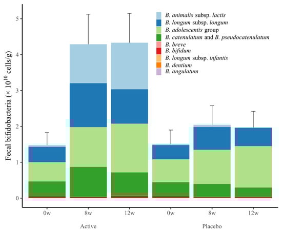 Changes in the number of fecal bifidobacteria in the placebo and active groups during the study period. Values are expressed as the sum of the mean ± standard error values of each species.