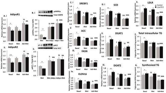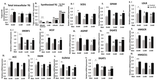 3.1. Low B12 Impedes Metformin Action on Intracellular TG and Expression of Genes in Fatty Acid Synthesis