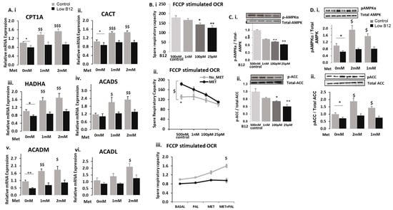 We assessed whether metformin was effective in upregulating FAO in hepatocytes with low B12. In the absence of metformin (0-mM), we observed that the expressions of CPT1a, CACT, HADHA, ACADS, ACADM and ACADL were significantly decreased in cells with low B12 compared with controls. However, in control cells with metformin treatment, there was a significant increase in the expression of CPT1a (35.5%), CACT (37.8%), HADHA (52.0%), ACADS (79.3%), ACADM (74.3%) and ACADL (27.9%) (Figure 2B). Contrarily, there was no significant increase in CPT1α (2.5%), CACT (14.7%), HADHA (14.1%), ACADS (29.6%), ACADM (23.6%) and ACADL (2.0%) in metformin-treated hepatocytes with low B12 (Figure 2A(i–vi)). This evidence suggests that in low-B12 hepatocytes, the expression of FAO genes is lower and their levels following metformin treatment were not significantly increased, therefore accounting for impaired FAO.