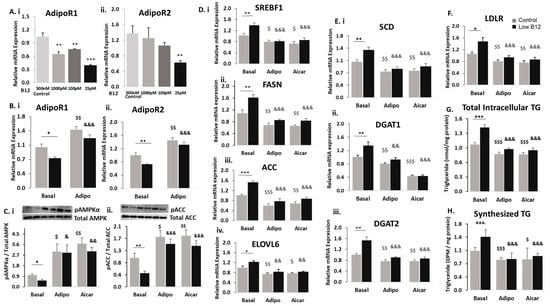 Adiponectin ameliorates the regulation of FA synthesis in low-B12 hepatocytes via increased AMPK activation and AdipoR1/R2 (A) The mRNA expression of AdipoR1 (i) and AdipoR2 (ii) under low B12 conditions and (B) mRNA expression of AdipoR1 (i) and AdipoR2 (ii) following 24 h treatment with 25 ng adiponectin. (C) Protein levels of pAMPKα (i) and pACC (ii) normalized to total AMPK and ACC, respectively in adiponectin [or AICAR (positive control)] treated hepatocytes. (D) mRNA expression of enzymes nuclear transcription factor SREBF1 (i) and enzymes regulating FA synthesis, such as FASN (ii), ACC (iii), ELOVL6 (iv); (E) triglyceride synthesis, such as SCD (i), DGAT1 (ii) and DGAT2 (iii); and (F) cholesterol synthesis, such as LDLR normalized to 18S rRNA endogenous control (Applied Biosystems, Knutsford, UK). (G) Total intracellular levels of triglycerides quantified in hepatocytes using the TG kit (ab65336) (Abcam Plc, Cambridge, UK) and normalized per milligram protein under each B12 condition. (H) Levels of synthesized TG in hepatocytes assessed with the radiochemical assay and quantified as disintegrations per minute (DPM) using the scintillation counter and normalized per milligram (mg) protein. The data is representative of mean ± SEM (n = 6), * represents significance compared to controls B12 (500 nM) and low B12 (25 pM), $—compared to controls B12 (500 nM) with adiponectin or aicar and &—compared to low B12 (25 pM) with adiponectin or aicar, respectively; * p < 0.05, ** p < 0.01, *** p< 0.001; $ < 0.05, $$ < 0.01, $$$ < 0.001; & < 0.05, && < 0.01, &&& < 0.001.