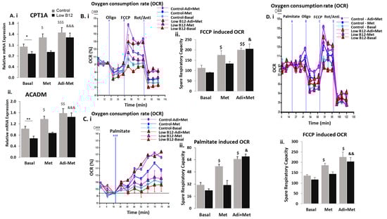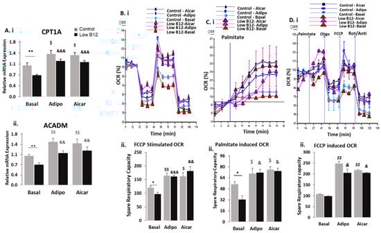 Combined treatment of adiponectin and metformin ameliorates the regulation of FAO in low-B12 hepatocytes via increased AMPK activation: The mRNA expression of key enzymes regulating FAO (A) such as CPT1 (i) and ACADM (ii) normalized to 18S rRNA endogenous control (Applied Biosystems, Knutsford, UK). (B) (i) Oxygen consumption rate (OCR) and (ii) spare respiratory capacity following combined treatment with 25 ng adiponectin and 2 mM metformin in hepatocytes incubated with a rich-substrate KHB medium containing glucose (2.5 mM), pyruvate (1 mM), amino acid (L-Glutamine) (2 mM) and BSA (0.1%) at pH 7.4 under various B12 conditions. (C) (i) Oxygen consumption rate (OCR) and (ii) spare respiratory capacity following injection with palmitate (200 µM)/BSA (33.3 µM) (basal control) in adiponectin and metformin-treated hepatocytes in a limited-substrate KHB medium containing only 0.5 mM L-carnitine and 1.25 mM glucose under different B12 conditions. (D) (i) Oxygen consumption rate (OCR) and (ii) spare respiratory capacity in hepatocytes exposed to palmitate (200 µM) and respiratory inhibitors (Oligomycin, FCCP and rotenone/antimycin). The data is representative of mean ± SEM (n = 6), and * represents significance compared to controls B12 (500 nM) and low B12 (25 pM), $—compared to controls B12 (500 nM) in only metformin or both metformin and adiponectin and &—compared to low B12 (25 pM) with both metformin and adiponectin, respectively; * p < 0.05, ** p < 0.01; $ < 0.05, $$ < 0.01, $$$ < 0.001; & < 0.05, && < 0.01, &&& < 0.001.