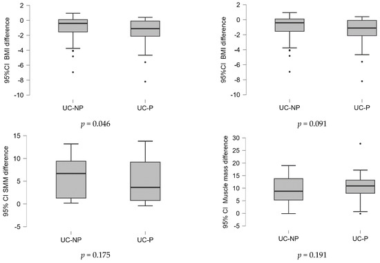Results from earlier research indicated that UC patients frequently lost skeletal muscle mass, which was more sensitive to changes in BMI [46,47]. An early diagnosis of skeletal muscle loss and malnutrition in UC patients could be made using body composition measurement, which could also help direct rapid therapeutic nutrition management [46].