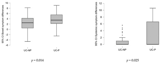 At baseline evaluation, the mean values of the total SIBDQ score showed a moderate to severe decline in life quality (<60) in both groups, without significant differences (45.21 in UC-P group vs. 45.58 in UC-P group, p = 0.061).