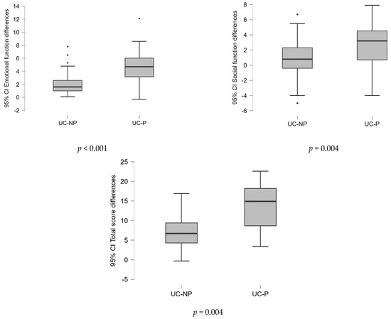 By applying the Wilcoxon signed rank test, a significant increase (p < 0.05) in the total and domain scores was observed in both groups, with a better evolution in the UC-P group (Table 6). In the UC-P group, the average SIBDQ total score increased slightly above 60 (60.47) at the final evaluation, which indicated a mild impairment of the quality of life, while in the UC-NP group this score remained below 60 (51.05), indicating a moderate impact on the quality of life of these patients.