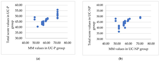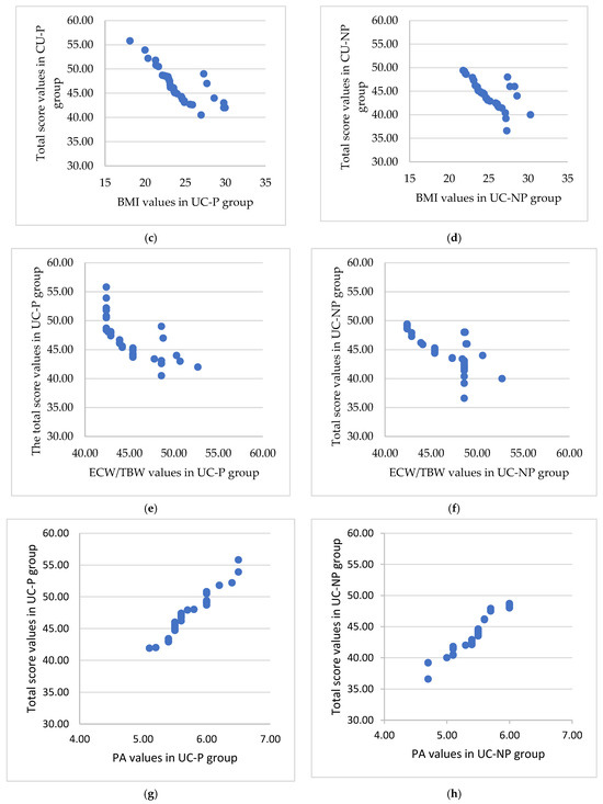 The significant association between the total score and the muscle mass, BMI, ratio ECW/TBW, and PA for the UC-P (a,c,e,g) and UC-NP group (b,d,f,h). (a) Strong positive significant association () between total score and muscle mass. (b) Medium positive significant association between total score and muscle mass. (c) Strong negative significant association between total score and BMI (UC-P group). (d) Medium negative significant association between total score and BMI (UC-NP group). (e) Strong negative significant association between total score and ratio ECW/TBW. (f) Strong negative significant association between total score and ratio ECW/TBW. (g) Very strong positive significant association () between total score and PA. (h) Very strong positive significant association (r = 0.96, p < 0.001) between total score and PA.