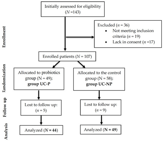 A total of 93 patients with a confirmed diagnosis of UC effectively participated in this observational follow-up randomized study, which was conducted between January 2022 and January 2023 in the Pharmacy Department of the University of Oradea, Oradea, Romania, in collaboration with a private dietetics’ office from the same town. Initially, the recruitment involved 143 consecutive UC patients aged ≥18 years from the specialist outpatients of the Bihor County Emergency Clinical Hospital and private clinics located in Oradea, Romania. The subjects included in the study had to meet diagnostic standards determined by clinical, laboratory, imaging, and endoscopic parameters, including histopathology, in accordance with the 2017 ECCO recommendations [66]. Subjects over 18 years of age, for whom body composition could be accurately determined, were selected. Patients with ascites and severe edema, those with oncological, musculo-skeletal or psychiatric pathologies, and those who took probiotics supplements in the last 6 months were excluded. After applying the inclusion/exclusion criteria, only 107 patients were enrolled in the study. Among them, 14 did not show up for all the evaluations and were excluded from the analysis (Figure 4). All the included patients were on treatment, recommended by a specialist.