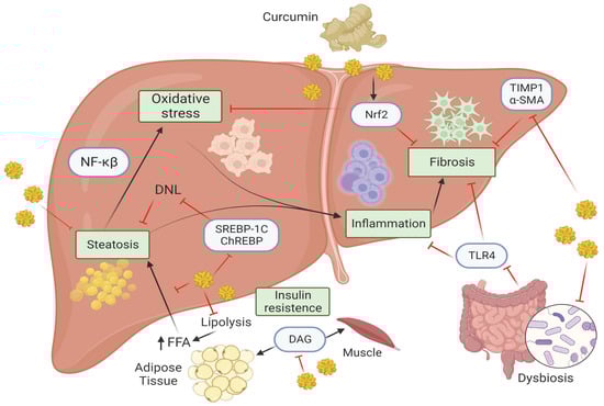 Molecular mechanism of curcumin in MASLD, Created with BioRender.com (Accesed on 1 October 2023). Curcumin, by acting on several molecular pathways, is able to attenuate the pathological processes that lead to the progression of MASLD. Curcumin reduces the accumulation of DAG in the muscle and adipose tissue thus affecting hepatic IR. Curcumin inhibits lipolysis thereby preventing the release of FFA from adipose tissue and preventing their accumulation in the liver (steatosis). The latter is also prevented by the inhibition of several factors such as ChREBP, SREBP1c, thus reducing DNL pathway. Hepatic steatosis enhances oxidative stress which is kept in check by curcumin through inhibition of Nrf2 pathway, which also acts on fibrosis. MASH is characterized by the presence of inflammation that in turn activates NF-κB pathway, which is inhibited by curcumin. Moreover, the gut microbiota can be regulated by curcumin through the inhibition of TLR4 signaling and consequently preventing inflammation and fibrosis. The latter is kept in check by curcumin through the inhibition of Nrf2, TIMP1 and α-SMA. Abbreviations: α-SMA, α-Smooth muscle actin; ChREBP, carbohydrate response element binding protein; DAG, diacyl glycerol; DNL, de novo lipogenesis; FFAs, free fatty acids; NF-κβ, Nuclear factor kappa β; NRF2, nuclear factor erythroid 2-related factor 2; SREBP1c, sterol regulatory element binding protein 1c; TIMP-1, metallopeptidase inhibitor type 1; TLR4, Toll-like receptor 4.