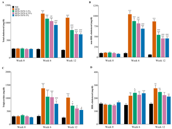 Supplementation with Totum-070 prevents hypercholesterolemia and hypertriglyceridemia in hamsters fed a high-fat diet. Male hamsters (n = 15/16 per group) were fed a normal diet (ND), high-fat diet (HFD), or HFD supplemented with Totum-070 at the following concentrations: 3.5% (HFD-T070 3.5%), 4.25% (HFD-T070 4,25%), and 5% (HFD-T070 5%). Blood samples were collected before the study’s start (week 0), during the study (week 6), and at the study’s end (week 12). (A) Concentration of total cholesterol; (B) non-HDL-cholesterol; (C) triglycerides; and (D) HDL-cholesterol in serum. * p < 0.05, ** p < 0.01, and *** p < 0.001 versus ND. # p < 0.05, ## p < 0.01, and ### p < 0.001 Totum-070 groups versus HFD. Data are the mean ± SEM.