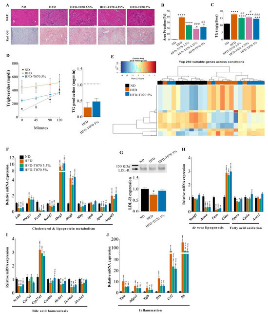 Effect of Totum-070 on liver lipid metabolism. (A) Paraffin-embedded sections of hamster livers stained with hematoxylin and eosin (H&E). Frozen sections of hamster livers stained with Oil Red O and counterstained with hematoxylin. Scale bars, 100 µm. (B) Quantification of Oil Red O in liver sections (at least three images per liver) shows reduction in neutral lipid accumulation in hamsters supplemented with Totum-070. (C) Triglyceride (TG) content in liver. (D) Changes in triglyceride concentration in serum samples collected at the indicated time points after injection of Poloxamer 407, and calculation of hepatic triglyceride (TG) production in HFD (n = 11) and HFD-T070 5% (n = 14) hamsters. An age-matched control group of hamsters (n = 6) was fed the ND. (E) Heatmap showing the top 250 genes differentially expressed (RNA-sequencing data) in hamster livers in the ND, HFD, and HFD-T070 5% groups (n = 8 per group) (F) Relative expression in liver of selected genes encoding proteins implicated in cholesterol and lipoprotein metabolism (n = 15/16 per group). (G) Immunoblot of LDL receptor expression in hamster liver samples from the indicated groups and quantification. (H) Relative expression in liver of selected genes encoding proteins implicated in lipid metabolism. (I) Relative expression in liver of selected genes encoding proteins implicated in bile acid metabolism. (J) Relative expression in liver of selected genes encoding proteins implicated in inflammation. * p < 0.05, ** p < 0.01, *** p < 0.001, and **** p < 0.00001 versus ND. # p < 0.05, ## p < 0.01, ### p < 0.001, and #### p < 0.00001 Totum-070 groups versus HFD. Data are the mean ± SEM.