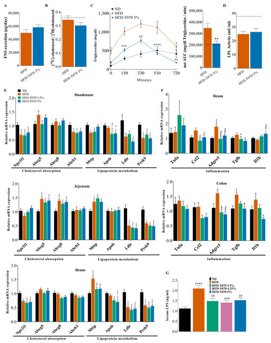 Effect of Totum-070 on intestinal lipid metabolism. (A) Excretion of fecal neutral sterols (FNS) quantified in fecal samples collected from day 75 to day 78. For each group (HFD and HFD-T070 5), pooled feces from 5 cages (n = 2/3 hamsters per cage) were used. (B) Results of the intestinal cholesterol absorption test performed after 12 weeks of supplementation in hamsters fed an HFD (n = 14) or HFD supplemented with T070 5% (n = 14). An age-matched control group of hamsters (n = 6) was fed the ND. (C) Changes in triglyceride concentration in serum after olive oil gavage, and calculation of the net area under the curve (AUC) in HFD (n = 13) and HFD-T070 5% (n = 13) hamsters after the oral fat tolerance test. An age-matched control group of hamsters (n = 6) was fed the ND. (D) Measurement of lipoprotein lipase (LPL) activity after heparin injection in HFD (n = 14) and HFD-T070 5% (n = 14) hamsters. An age-matched control group of hamsters (n = 6) was fed the ND. (E) Expression of genes encoding proteins implicated in lipid and lipoprotein metabolism in duodenum, jejunum and ileum. (F) Expression of genes encoding inflammation markers in ileum and colon. (G) Concentration of lipopolysaccharides (LPS) in the serum after 12 weeks. * p < 0.05, ** p < 0.01, *** p < 0.001, and **** p < 0.00001 versus ND. # p < 0.05, ## p < 0.01, ### p < 0.001, and #### p < 0.0001 (Totum-070 groups versus HFD). Data are the mean ± SEM.
