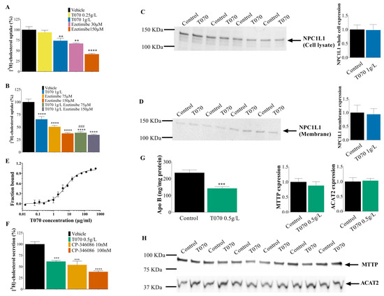 Human colon colorectal adenocarcinoma Caco-2 cells (Sigma, Saint-Louis, MO, USA) were maintained in DMEM 4.5 g/L glucose supplemented with 2 mM glutamine, 1% nonessential amino acids, 20% fetal bovine serum, and 1% penicillin/streptomycin. For the experiments, Caco-2 cells were seeded on 1.0 µm transparent polyethylene terephthalate membrane inserts and allowed to differentiate for 21 days. Radioactive micelles were prepared freshly according to [42]. Briefly, lipids were added to the cells in the apical pole in the DMEM/serum-free medium as a complex lipid emulsion containing 0.4 mM oleic acid, 0.2 mM L-α-lysophosphatidylcholine, 0.05 mM cholesterol, 0.2 mM 2-oleoylglycerol, and 2 mM taurocholic acid and supplemented with [1,2-3H(N)]-cholesterol (2 µCi/mL). For the [3H]-cholesterol uptake assay, Caco-2 cells were incubated with radioactive micelles and with/without Totum-070 for 1 h. Then, the cell layers were washed, and the cell lysates were collected for protein determination. The cell lysates were mixed directly in the liquid scintillators (Ultima Gold, Perkin Elmer, Every, France). The radioactivity was counted with a TRI-CARB 4910TR Liquid Scintillation Counter and normalized to the cell protein content. In some conditions, ezetimibe (Sigma, Saint-Louis, MO, USA) was added directly in the apical medium as a positive control of [3H]-cholesterol uptake inhibition. For the [3H]-cholesterol secretion assay, the Caco-2 cells were first loaded with radioactive micelles in the upper compartment for 24 h. Then, the cells were washed, and the apical medium was changed to DMEM containing Totum-070 at the indicated concentration. After overnight incubation, the basolateral medium was collected and the lipoproteins secreted in the basolateral medium were separated from the free tracers with a PD-10 Sephadex-G25 desalting column (Sigma, Saint-Louis, MO, USA) [43]. The purified fraction was suspended in a liquid scintillator (Ultima Gold, Perkin Elmer, Every, France), and the radioactivity was counted with a TRI-CARB 4910TR Liquid Scintillation Counter. The radioactivity in each vial was normalized to the cell protein content. For the apolipoprotein B (ApoB) secretion measurement, a protocol similar to the one for cholesterol secretion quantification was used, but without radiolabeled cholesterol during the cell loading with micelles. The ApoB secretion into the basolateral medium after overnight incubation was quantified with the Human Apolipoprotein B ELISA Kit (Abcam, Boston, MA, USA). MTTP and ACAT2 were detected by Western blotting using cells in the same culture condition described above. For NPC1L1 detection by Western blotting in whole-cell and in the cell membrane lysates, a protocol similar to the one for the cholesterol uptake assay was used but with non-radioactive micelles.