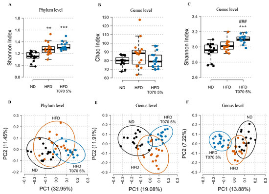 Whole 16S rRNA gene sequencing of the cecum content was used to assess the impact of the ND, HFD, and HFD supplemented with 5% Totum-070 on the intestinal microbiota composition at the study’s end. At the phylum level, evenness was significantly increased in the HFD (p < 0.01) and HFD-T070 5% (p < 0.001) groups compared with the ND group (Figure 5A), without any difference between HFD and HFD-T0710 5%. At the genus level, species richness was similar in the three groups (Figure 5B). Conversely, evenness was increased in the HFD-T070 5% group compared with both the HFD (p < 0.001) and ND groups (p < 0.001) (Figure 5C). A principal coordinate analysis of the relative abundance of intestinal microbial communities at the phylum level using the Bray–Curtis dissimilarity index followed by PERMANOVA showed that the microbial composition differed significantly among the three groups (Bray–Curtis, adonis: p < 0.0001 for all the groups, RNDvsHFD = 0.24, RNDvsHFD-T0705% = 0.60, RHFDvsHFD-T0705% = 0.31) (Figure 5D). The same analysis at the genus level confirmed that the HFD strongly affected the microbial composition in the cecum compared with the ND (Bray–Curtis, adonis: p < 0.0001, RNDvsHFD = 0.26 (Figure 5E) and Jaccard, adonis: p < 0.0001, RNDvsHFD = 0.12 (Figure 5F)). The microbial composition in the HFD-T070 5% group differed from that of the ND group (Bray–Curtis, adonis: p < 0.0001 RNDvsHFD-T0705% = 0.36 (Figure 5E) and Jaccard, adonis: p < 0.0001, RNDvsHFD-T0705% = 0.25 (Figure 5F)), as well as the HFD group (Bray–Curtis, adonis: p < 0.0001, RHFDvsHFD-T0705% = 0.21 (Figure 5E) and Jaccard, adonis: p < 0.0001, RHFDvsHFD-T0705% = 0.17 (Figure 5F)). This highlighted a stronger impact of the HFD with Totum-070 supplementation than HFD alone at the genus level.