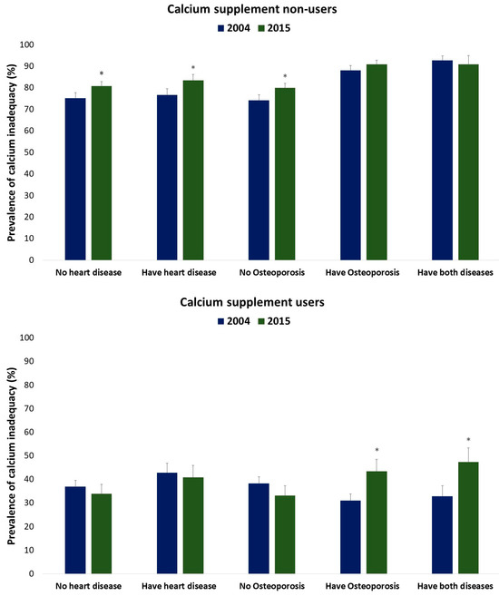 Prevalence of calcium inadequacy among individuals who had heart disease, osteoporosis, or both in 2004 and 2015, comparing supplement users and non-users. Calcium inadequacy was defined as an intake level below the EAR of 800 mg for males aged 51–70 years, 1000 mg for females aged 51–70 years, and 1000 mg for all individuals over 70 years, as specified by the IOM. The analysis was conducted separately for the 2004 and 2015 data sets. * Significant difference (p < 0.05) in supplement users between 2004 and 2015 based on age/sex groups using the confidence interval overlap technique.
