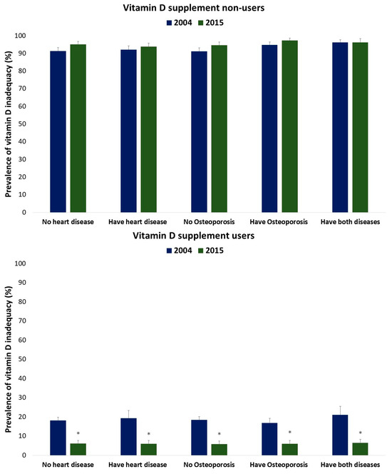 Prevalence of vitamin D inadequacy among individuals who had heart disease, osteoporosis, or both in 2004 and 2015, comparing supplement users and non-users. Vitamin D inadequacy was identified when intake levels were below the EAR of 10 µg (400 IU) for individuals aged 50 years and above, following the IOM recommendations. The analysis was conducted separately for the 2004 and 2015 data sets. * Significant difference (p < 0.05) in supplement users between 2004 and 2015 based on age/sex groups using the confidence interval overlap technique.