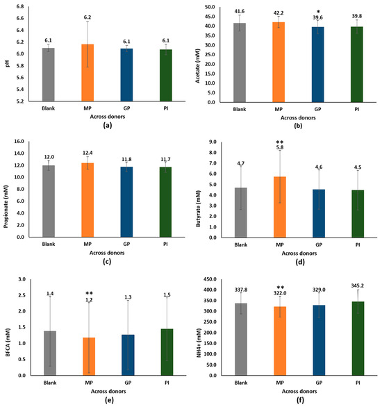 Effect of three probiotics-based food supplements on the metabolomics activity of the intestinal microbiota in healthy adult donors, in reference to (a) pH, (b) acetate, (c) propionate, (d) butyrate, (e) BFCAs, and (f) ammonium, in the ex vivo model CoaP®, after 48 h starting the exposition. * p < 0.05, ** p < 0.03 for differences between the supplemented and blank samples. Data are plotted as mean (all six donors) ± standard error. MP: MultiPro, containing a combination of L. acidophilus NCFM®, L. paracasei Lpc-37™, B. lactis Bi-07™, and B. lactis Bl-04™ strains; GP: GastricPro, containoing L. acidophilus NCFM®, with active ingredients such as lactase, bromelain, and extracts of chamomile, fennel, and mint. PI: ProIntestino, which combines B. longum ES1 and active ingredients such as lavender flower extract, which improves digestive comfort in cases of stress, glutamine, and omega 3 fatty acids (EPA + DHA).