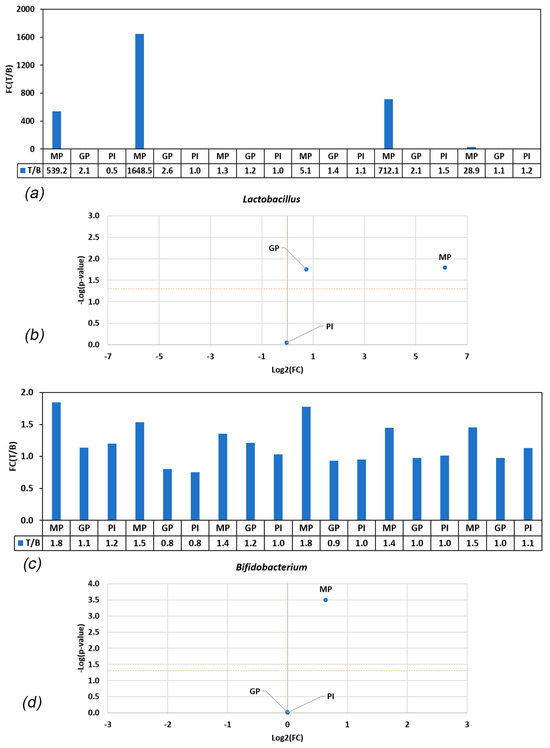 (a,c) Ratios of Lactobacillus spp. and Bifidobacterium spp. abundances in treatment versus blank (T/B) in the various conditions. Values > 1 indicate enrichment in treatment; values < 1 indicate enrichment in blank. FC = fold change; T = treatment; B = blank. (b,d) Volcano plot showing difference in abundance of Bifidobacterium and Lactobacillus spp. in blank and treatment. Statistical significance (−log(p-value)) is plotted in the function of fold change (treatment/blank), classifying treatments into one of four categories: non-significantly lower enrichment than blank control (bottom left), significantly lower enrichment than blank control (top left), non-significantly higher enrichment than blank control (bottom right), and a significantly higher enrichment than blank control (top right). The horizontal orange line indicates the level above which an effect is statistically significant compared to the blank across the six donors. The vertical orange line marks the separation between stronger enrichment versus blank control (right) or lower enrichment compared to blank (left). FC = fold change.
