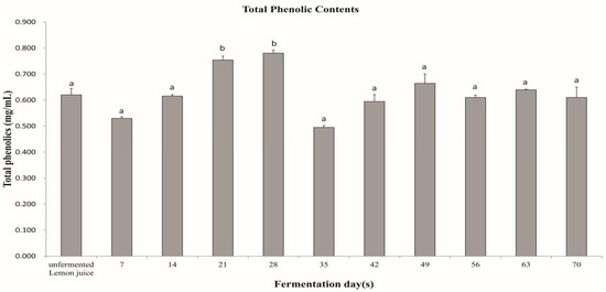 Total phenolic content of the unfermented and fermented lemon juice over time (days). Data are mean ± SD. Values with different superscript letters in the same row are significantly different, p < 0.05, by the one-way analysis of variance and Duncan’s multiple range test post hoc tests.