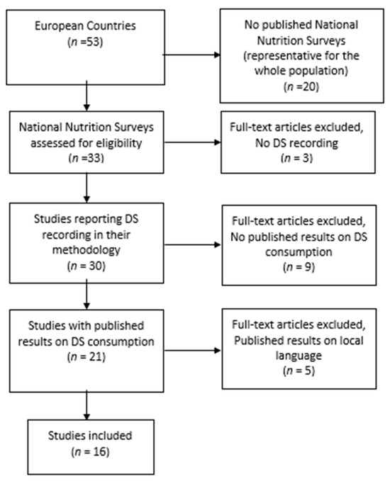 For the current approach, to identify the DS consumption data in European countries, NNSs were retrieved, and a search for the record of DSs in national representative studies was also conducted. Several approaches were used to retrieve and explore the reports or publications.