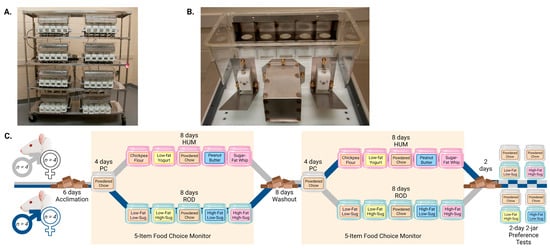 The rats were allowed a 6-day period of acclimation to our facility. Pelleted-chow intake and body weight were measured daily during acclimation. After acclimation, the rats were placed into our FCM. After 4 days in the apparatus, during which the rats received powdered rodent chow only, one half of the rats (groups matched by weight and sex) were given the ROD diet while the other half received the HUM diet. After 8 days on the choice diets, the rats were returned to standard cages and pelleted chow for an 8-day washout period. The washout was included so that the rats would start the second FCM testing period in a physiological state more like when they began the first cafeteria phase rather than in a state of increased weight gain. During washout, pelleted-chow intake and body weight were measured daily. After washout, the rats were returned to the FCM and given 4 days of powdered chow before being offered the opposite choice diet from their first FCM session. We used a crossover design to account for differences caused by which diet was offered first. At the conclusion of food-choice monitoring, the rats were returned to regular cages for two days and then divided by sex and order of diet exposure for a series of 48 h 2-jar tests to assess preference for the custom rodent diets compared to powdered chow, since they were not tested previously. Preference for the human-food choices compared to chow has been reported []. The experimental timeline is depicted in Figure 1C.