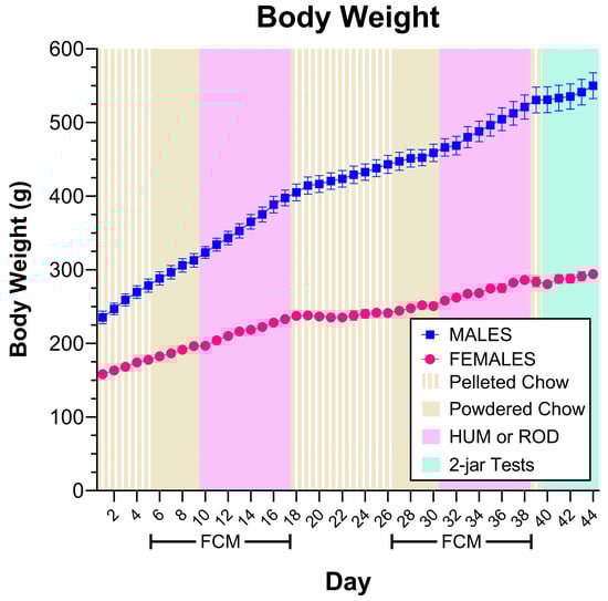 Rats of the same sex remained similar in body weight throughout the study (Figure 2). The lack of differences in body weight across diets suggests that, overall, rats responded similarly to the HUM and ROD diets.