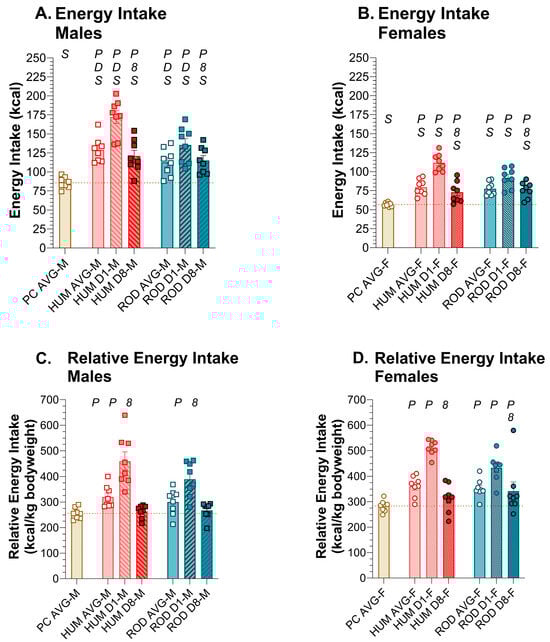 Energy intake increased with choice diets. Average energy intake for powdered chow (PC, tan bar), the human-foods diet array (HUM, orange bars), and the custom rodent diet array (ROD, teal bars) and intake on the first (D1) and last (D8) day of each choice diet shown as MEAN ± SE. Individual animals are represented by squares (males) or circles (females). The tan horizontal dashed line represents the mean for PC. The letters/numbers above the bars denote Bonferroni-corrected statistical differences: P = ROD/HUM vs. PC average; D = ROD/HUM vs. each other; 8 = day 8 vs. day 1; S = males vs. females. Statistical details are in Table 2 and Table 3. (A). Energy intake of male rats. (B). Energy intake of female rats. (C). Relative energy intake of male rats. (D). Relative energy intake of female rats.