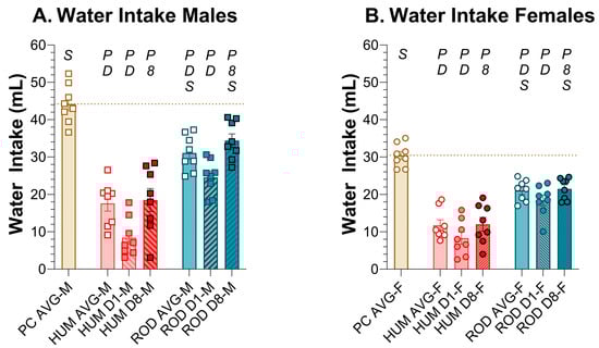 Water intake decreased on choice diets. Average water intake for the powdered chow (PC, tan bar), the human-foods diet array (HUM, orange bars), and the custom rodent diet array (ROD, teal bars) phases and intake on the first (D1) and last (D8) day of each choice diet shown as MEAN ± SE. Individual animals are represented by squares (males) or circles (females). The tan horizontal dashed line represents the mean for PC. The letters/numbers above the bars denote Bonferroni-corrected statistical differences: P = ROD/HUM vs. PC average; D = ROD/HUM vs. each other; 8 = day 8 vs. day 1; S = males vs. females. Statistical details are in Table 2 and Table 3. (A). Water intake of male rats. (B). Water intake of female rats.
