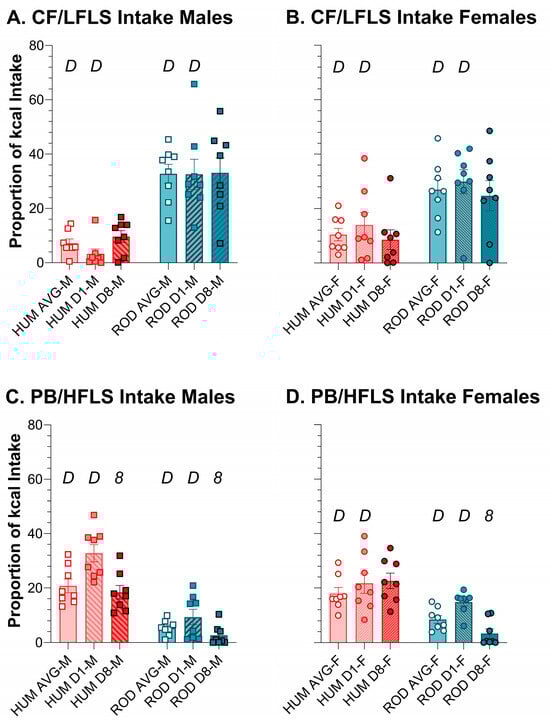 Average intake of the low-sugar choices differed between the HUM (orange bars) and ROD diets (teal bars) for males (squares) and females (circles). Average intake and intake on Day 1 and Day 8 of each choice diet shown as a proportion of total kcal (MEAN ± SE). Nutritionally similar food choices between the HUM and ROD diets are shown side by side (nutritional details can be found in Table 1). ROD choices were high (H) or low (L) in fat (F) and/or sugar (S). CF = chickpea flour; PB = creamy peanut butter. Bonferroni-corrected statistical differences: D = ROD/HUM vs. each other; 8 = day 8 vs. day 1. Statistical details are in Table 4 and Table 5. CF/LFLS intake of (A) males and (B) females. PB/HFLS intake of (C) males and (D) females.